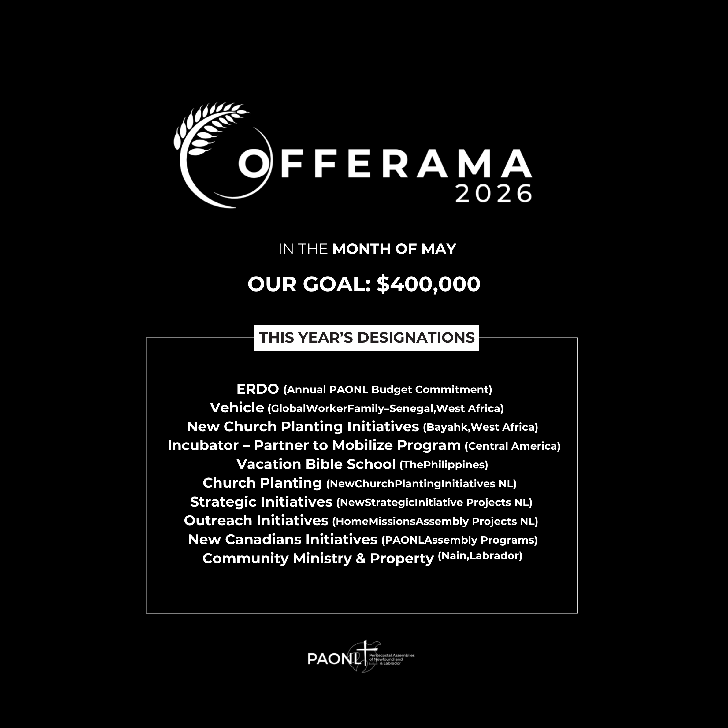 Missions Offerama is an annual fundraising initiative of the PAONL. Since its inception 2+ decades ago, our Pentecostal family has sacrificially given over $9 million to reach people in more than 40 countries on 5 continents. This is about 10% of our overall Missions Program during that period.